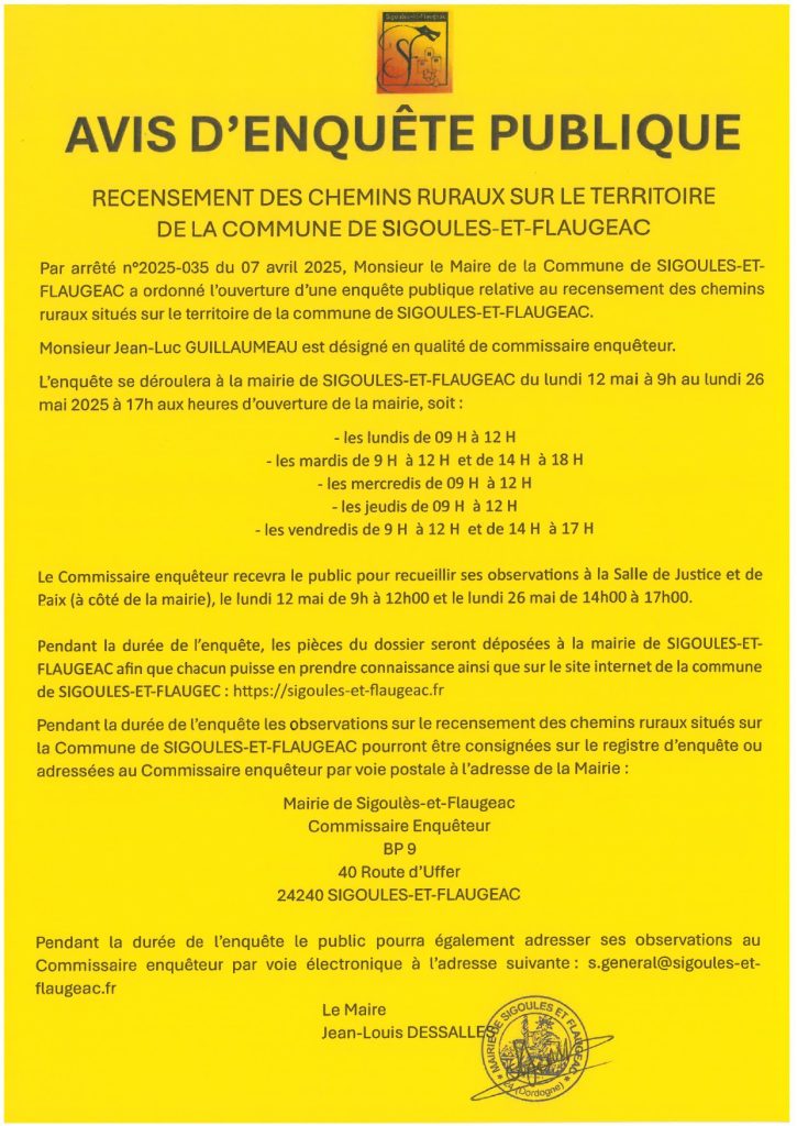 Par arrêté n°2025-035 du 07/04/2025, Monsieur le maire a ordonné l’ouverture d’une enquête publique relative au recensement des chemins ruraux de la commune.