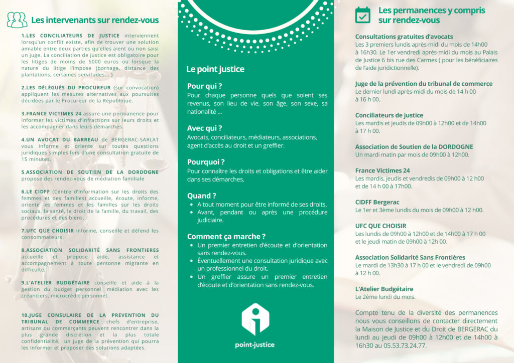 Pour régler un problème et faire appel au Conciliateur de Justice, il n’y a aucune formalité particulière à effectuer. Pour le rencontrer, il suffit de prendre rendez-vous au Secrétariat de la Mairie de Sigoulès-et-Flaugeac au 05.53.58.40.42.